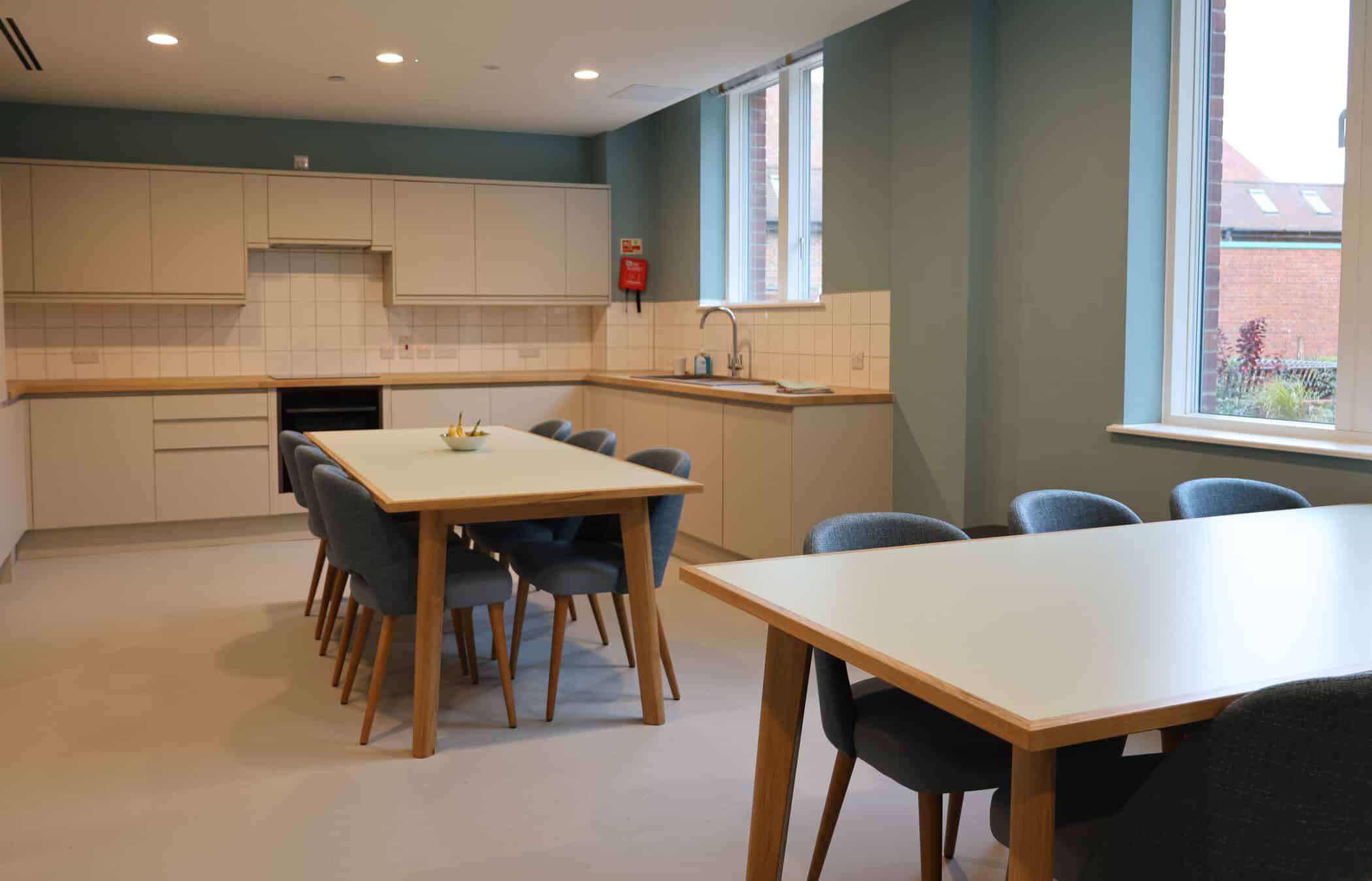 The ground floor of the new building houses communal seating, recreation areas and social spaces, including a kitchen and dining area, a common room, boot room, laundry collection room, and a lift so the whole building is fully accessible.