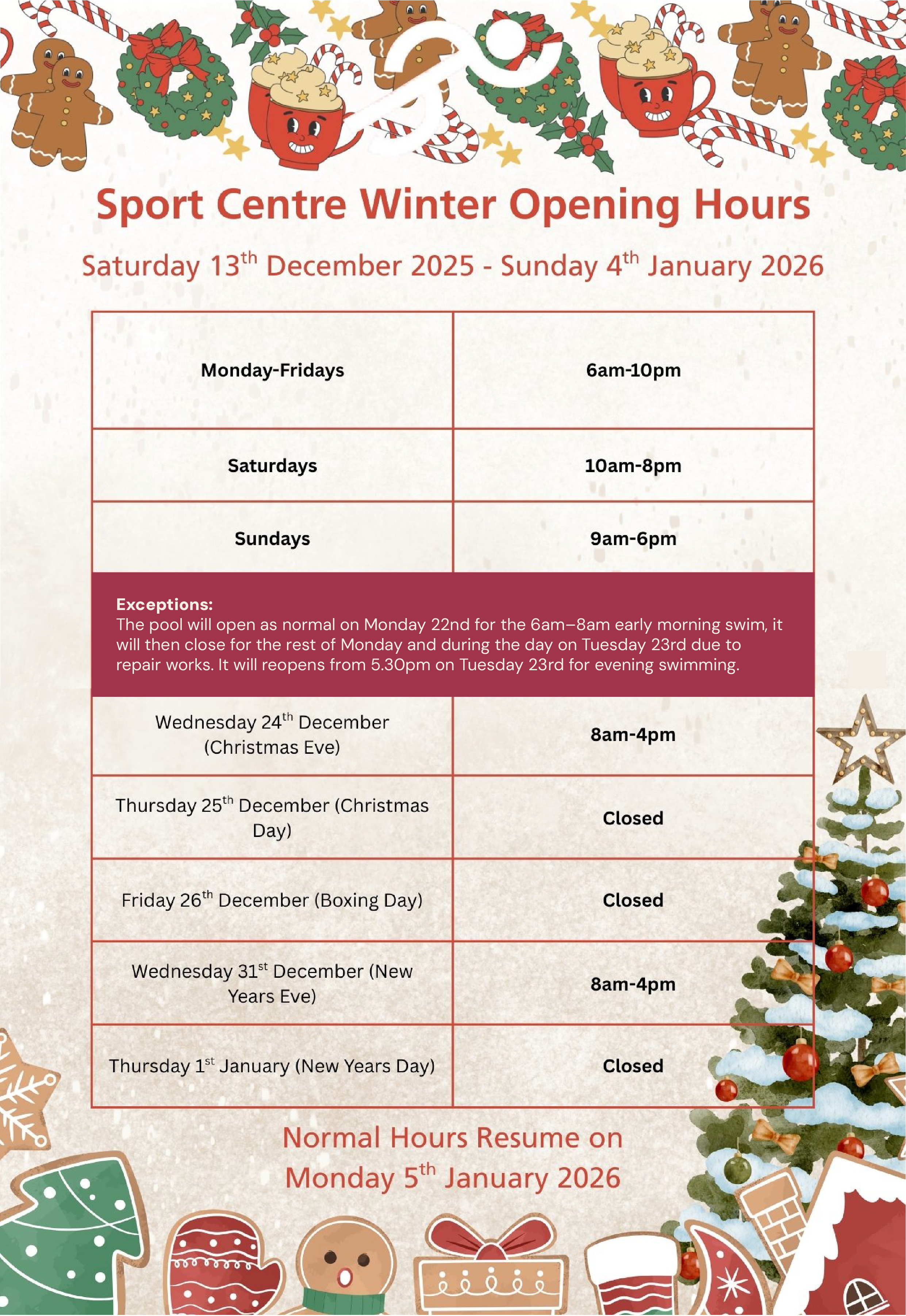 * Group swimming lessons occur during term time and may result in reduced access to the main and learner pools.