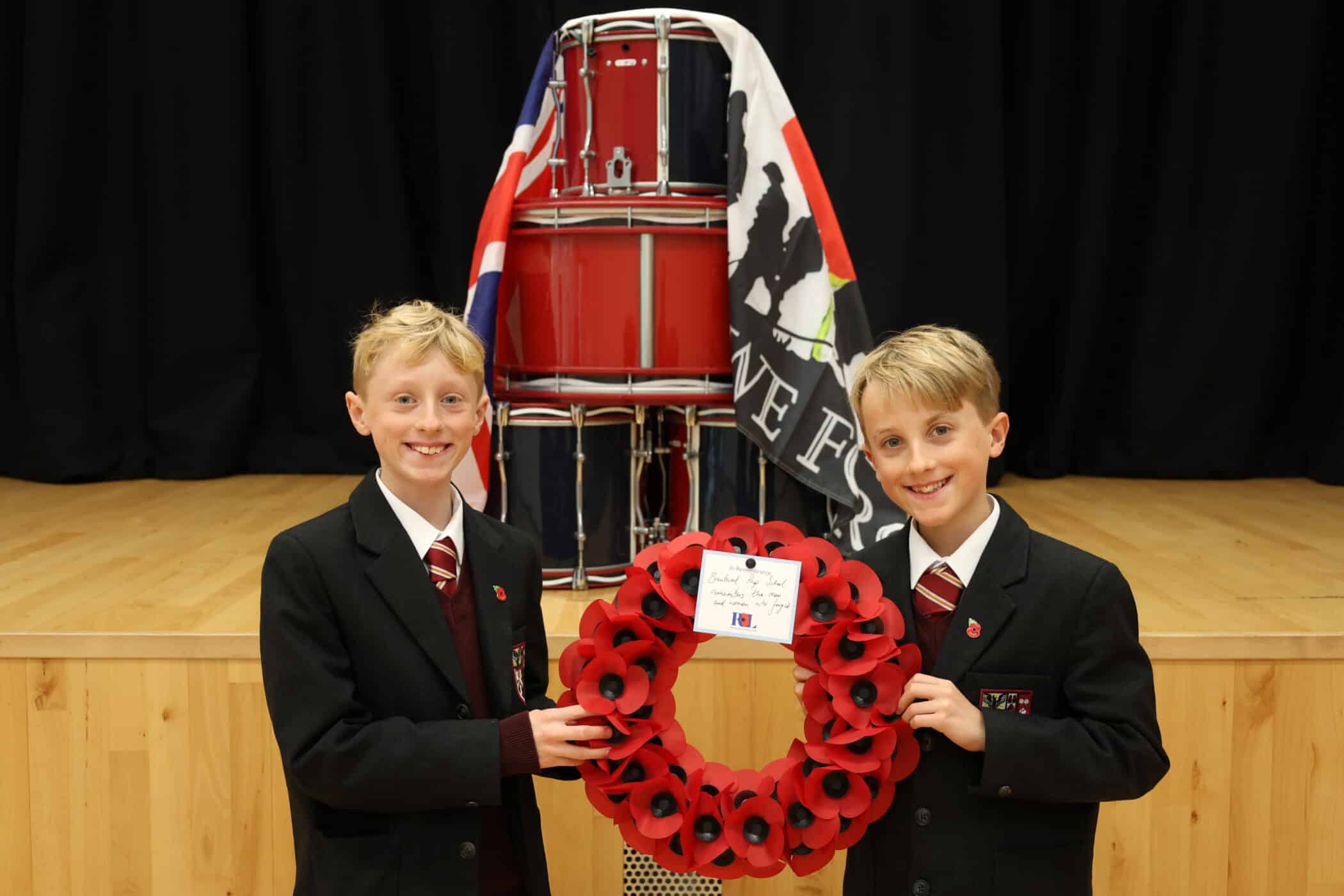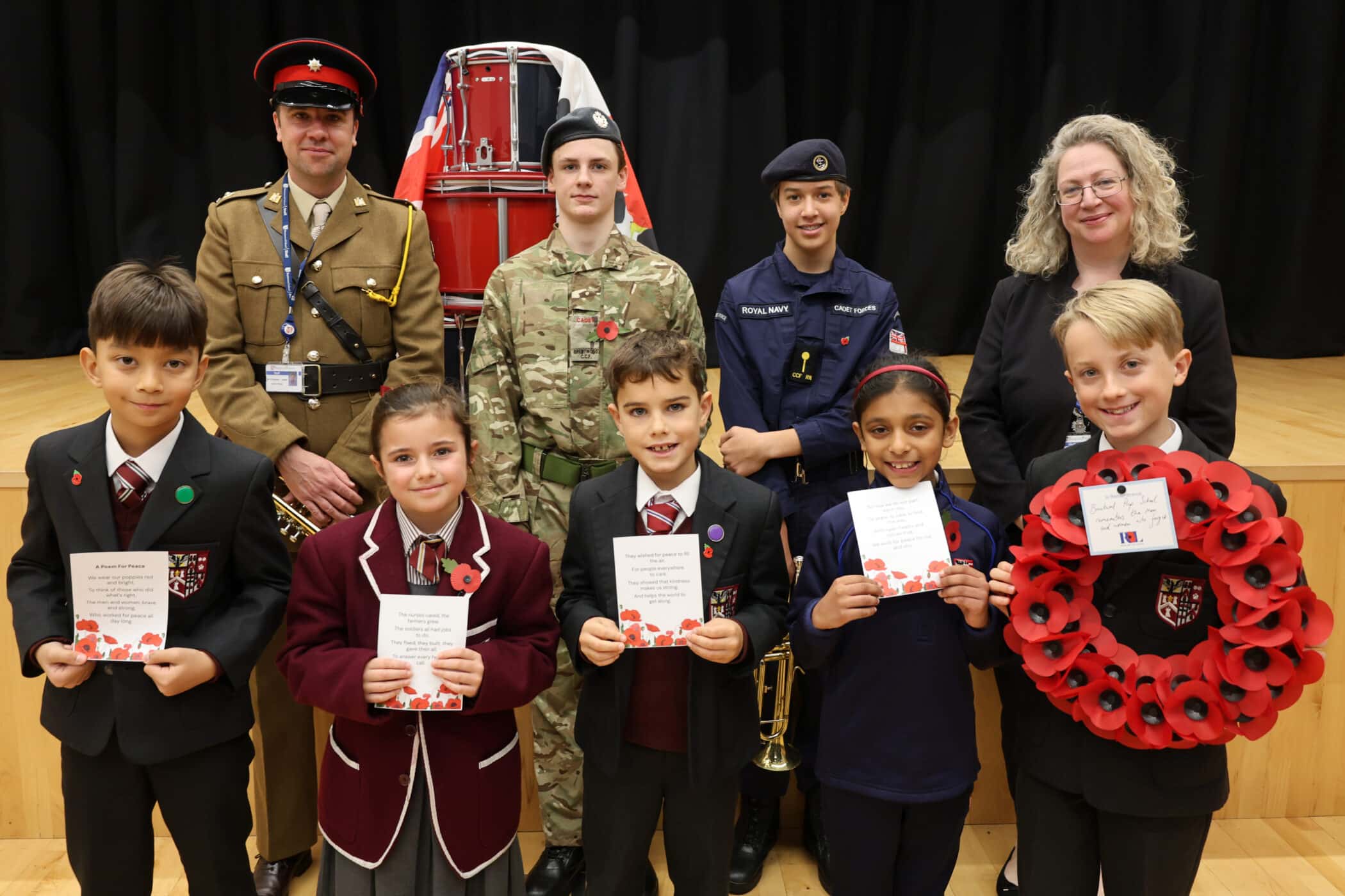 The Remembrance Service events in school on Tuesday were both poignant and an opportunity to experience being a community across all aspects of school. For the first time the Prep Chapel Choir sang in the chapel for the Remembrance Service and for the second year running a Prep pupil, Thomas, who you will hear more about shortly, laid a wreath alongside Skye, our Head of School in the Upper Sixth. Our Year 5s, 6s and the Prep Chapel Choir alongside 12 pupils from Year 1 to 3 joined with the older children outside the pavilion for the second part of the service at the Senior School. And here in the Prep Hall we were joined by three Senior School members, Music teacher Mr Ashman-Jones, and Liam and Harry as our trumpeters who played the Last Post and Reveille wonderfully. Mr Sell, Quartermaster in the CCF, set up our Drum Head in advance so that the symbolism and significance could be experienced by Prep pupils. Oliver, brother of Thomas, laid our Prep wreath and four Year 4 pupils, Alex, Ella, Isaac and Sansaar read a Remembrance poem.