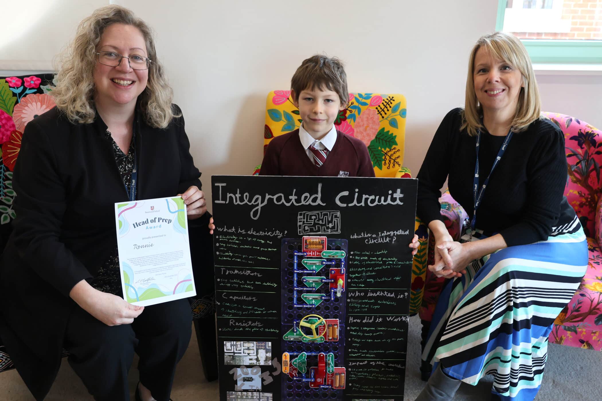 Ronnie W in Year 2 is receiving his Head of Prep award for demonstrating his great interest in electrical engineering. As part of his PYP Inquiry this term, which focuses on inventions that impact people’s lives, the Year 2 pupils were asked to research an invention or inventor of their choice. Ronnie decided to research and give a presentation on the invention of the integrated circuit. He created an eye-catching display, which included practical equipment to give his audience hands-on experience of how an integrated circuit works.