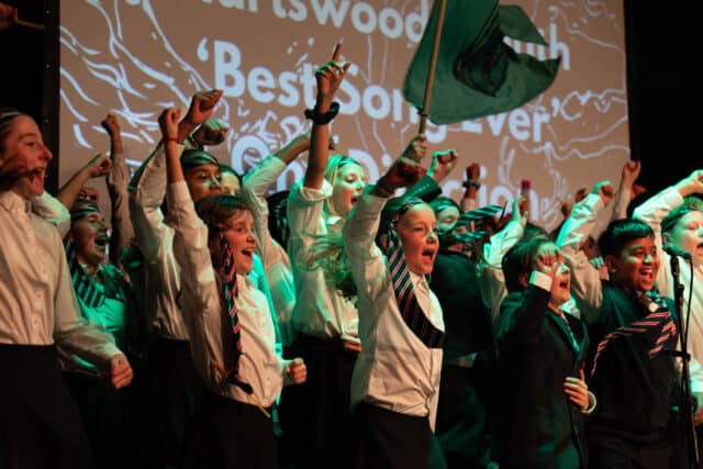 Last – but certainly not least – was our Unison category, which saw hundreds of our students and the entirety of the 2025/26 Year 7 cohort take to the stage in one final bid to score points and bring the house down in a performance of a pop song of their choosing. Despite very impressive performances of hits by One Direction, Bruno Mars, the Jackson 5, and even more ABBA, it was East and School once again who came out on top, scoring a perfect 20/20 for their electric performance of Shut Up and Dance by WALK THE MOON, led by a directorial dream team of Chloe B., Wren T., Kateryna S., and Mariia E. Again, although one House pairing could emerge victorious, all those involved went above and beyond in their singing, dancing, choreography, and inspired use of props as they brought the number of performers on the night to well over 600!